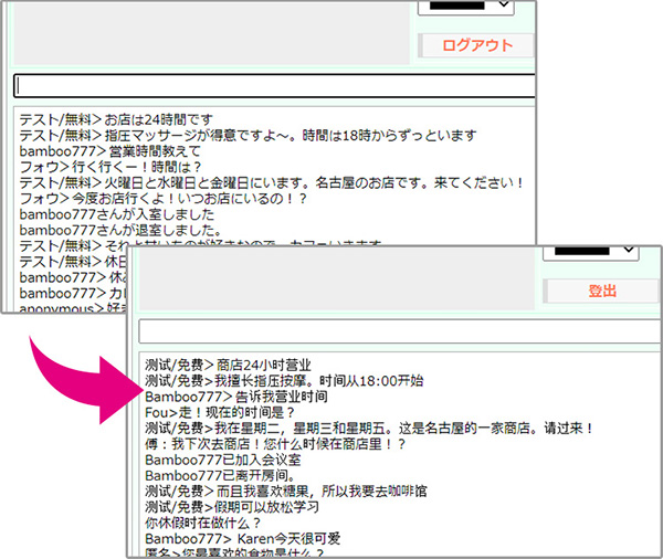 日本語で入力したものが中国語でチャット欄に表示されます。